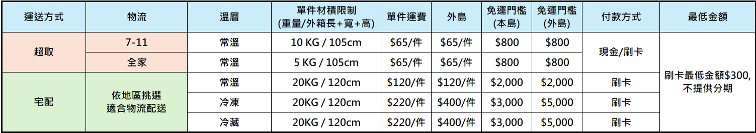 | 付款方式 | 運送方式 | 備註 |